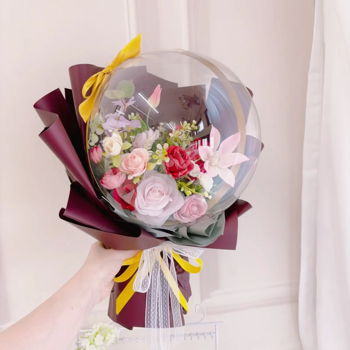 氣球花真的好難製作,好多手工!好麻煩!但它打破了花束的固有形態,把「浪漫」裝進了這顆可愛的水星球裡~誰能拒絕這樣一束把心思和美感都拉滿的氣球花束呢?反正我是愛了~ 你看這束花,被輕輕安放進通透的波波球裡,每一朵花的嬌豔、每一片葉的柔軟,都被這層「夢幻屏障」精心守護著。外層的酒紅色包裝紙沉穩大氣,黃色緞帶又添了幾分活潑明媚,拿在手上,既是花束,又像一件藝術品,走在哪都能成為視線焦點~ #氣球花 #balloon #水晶氣球 #水晶氣球花 #balloonbouquet